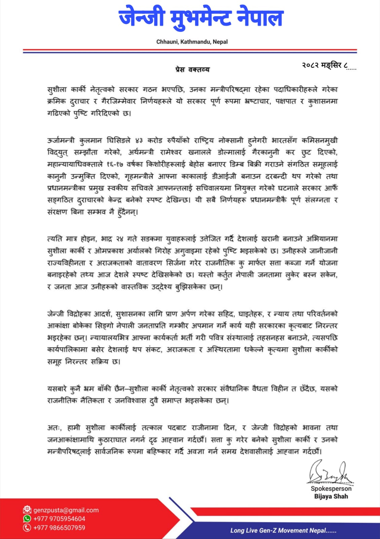 सोमबार विज्ञप्ति जारी गर्दै जेनजी मुभमेन्ट नेपालले सरकारमाथि भ्रष्टाचार, दुराचार र संवैधानिक अतिक्रमणको आरोप लगाउँदै राजीनामा मागेको हो ।